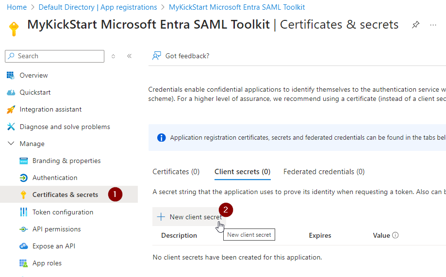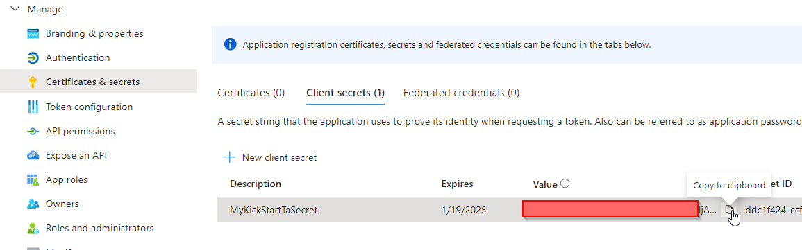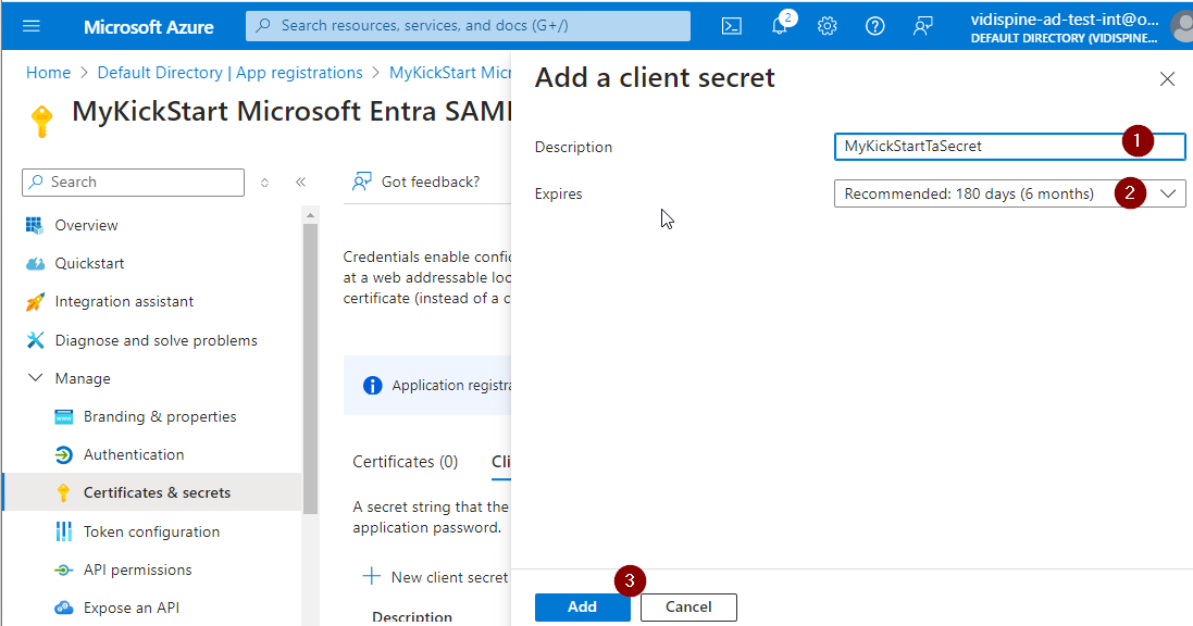 Select “Certificates & secrets” and “New client secret”