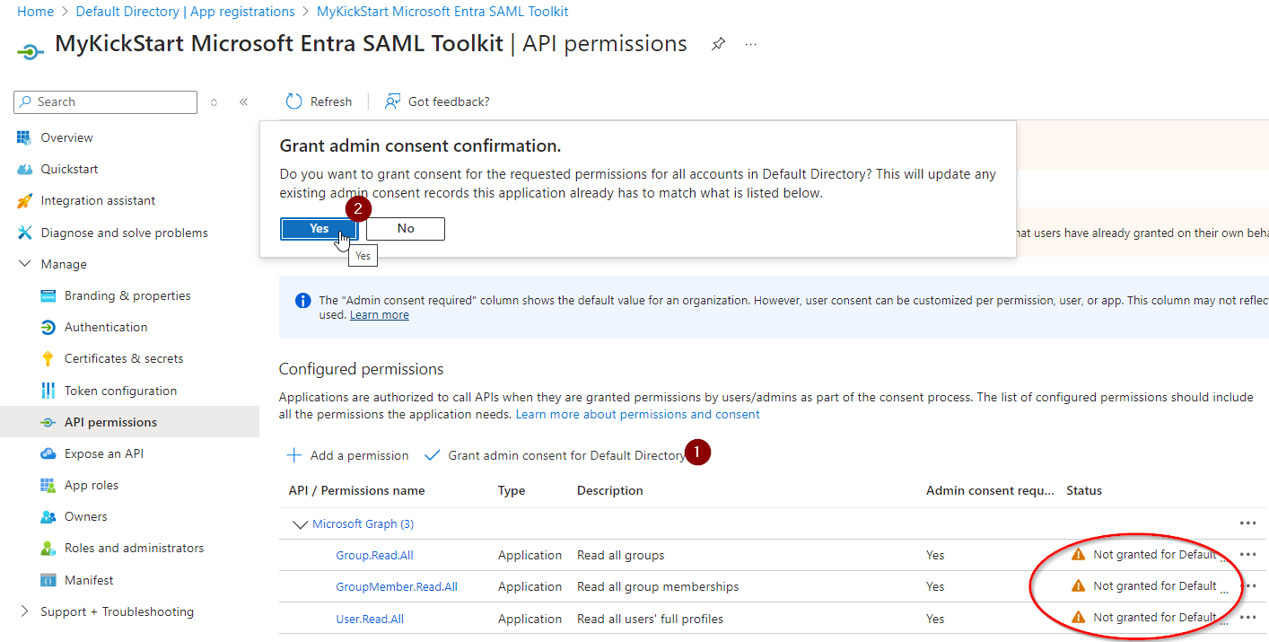 Select “Grant admin consent for Default Directory”