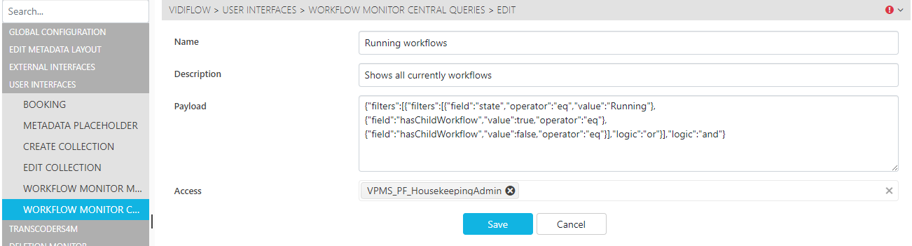 The VidiFlow Workflow Monitor supports centrally configured queries for often-needed maintenance situations (see Central Queries). These queries can be assigned to different user groups.