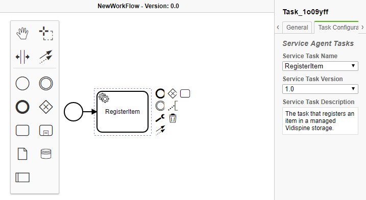 Assets in the object repository are called items. To create an item for a given video file one can use the "RegisterItem" task. Add a service task to the workflow and select the corresponding task as described in the Start Event and Append Task [C OG] and Change Task Type [C OG] sections.