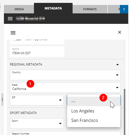 When choosing a specific value from a dropdown (enum metdata type field) such as a country’s state (1), another metadata field (2) may restrict which values are made available in another field such as the cities available within that state.