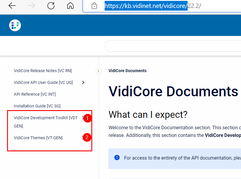 This group contains the VidiCore Development Toolkit documentation (1) as well as Theme documentation (2).