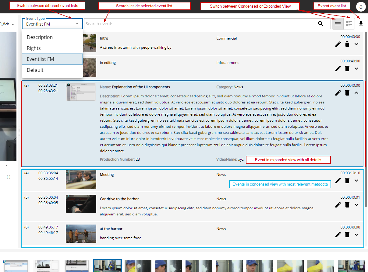 On the left hand side of the header you can switch between different event list types, e.g. there might be a descriptive event list as well as an event list for capturing the content rights. Each event list type has a different purpose and thus could have different metadata fields. However it depends on the system design if there are multiple event lists and how they are labeled.