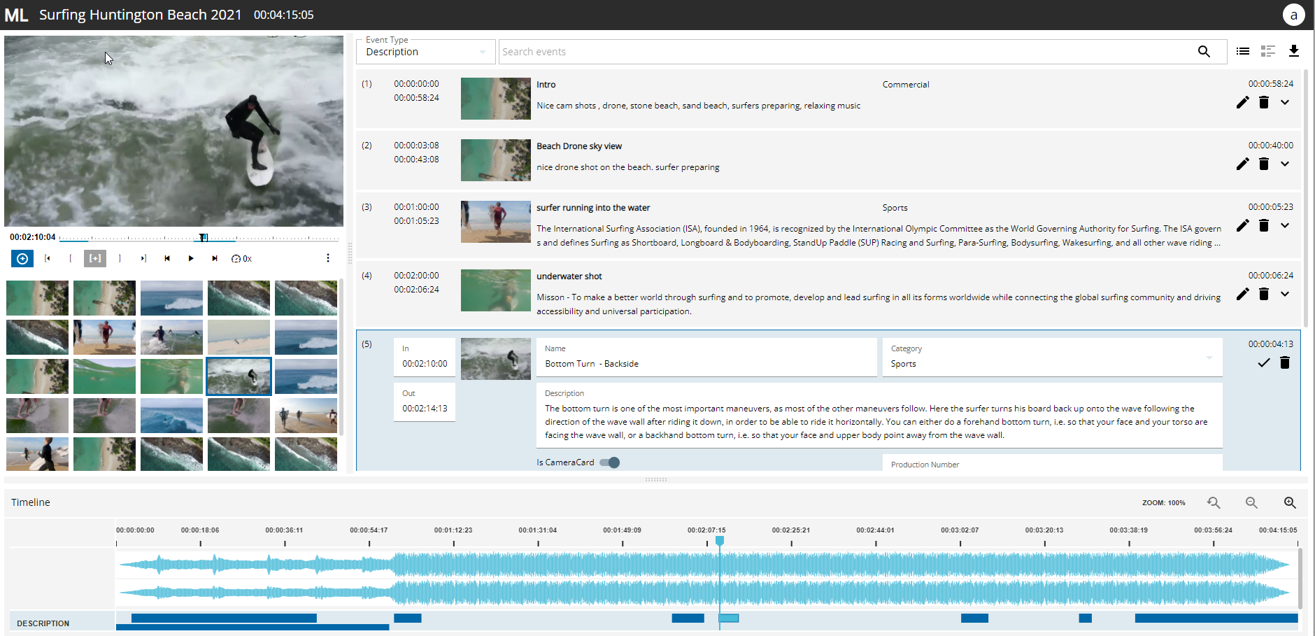 Player: to control the video/audio playback and set IN/OUT markers