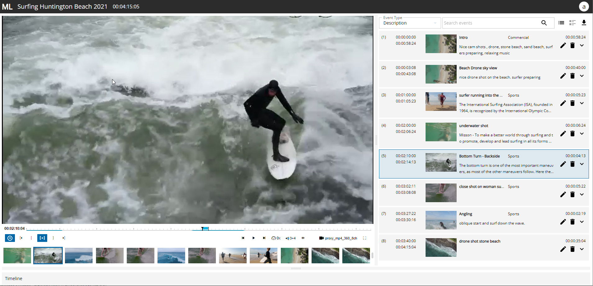 Player: to control the video/audio playback and set IN/OUT markers