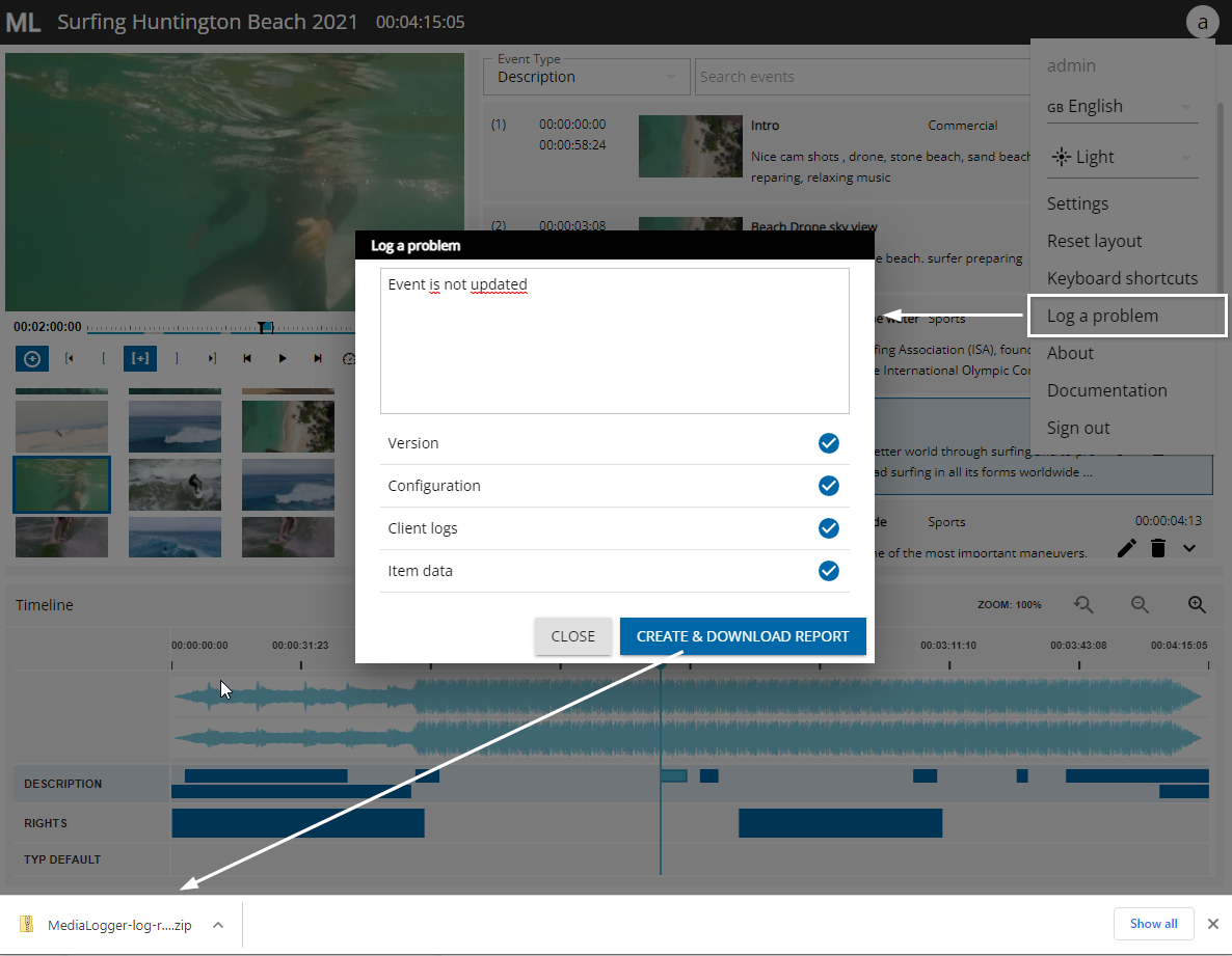 In case users face irregularities or problems when using the MediaLogger they can go to the main menu and select the option “Log a problem”. This will open up a dialog where the user should enter a short description of the problem. When pressing “Create & download report” a zip-file is created containing this error message, version numbers of MediaLogger and Vidicore, the configurations, item data as well as browser logs. This zip-file could then be send to an adminstrator or support team.