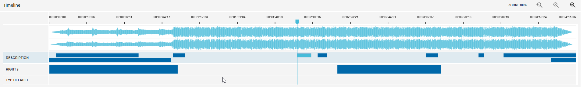 The timeline provides an overview of all the events, different event lists for the complete video or audio file. All configured event lists are shown below each other. Users can click on one of the events so that the player and event list navigates to the IN point of this event and the corresponding event list.