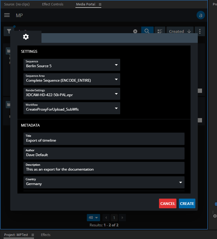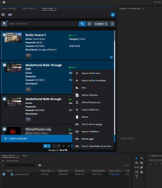 The MediaPortal can be run as extension within Adobe Premiere Pro. In Version 22.2, the the following features are covered: