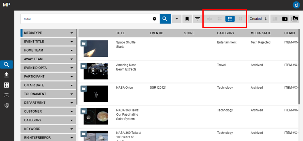 Having performed a search in MediaPortal, users are able to focus on different aspects of their matches when viewing and evaluating their results. Users can switch between the following views: