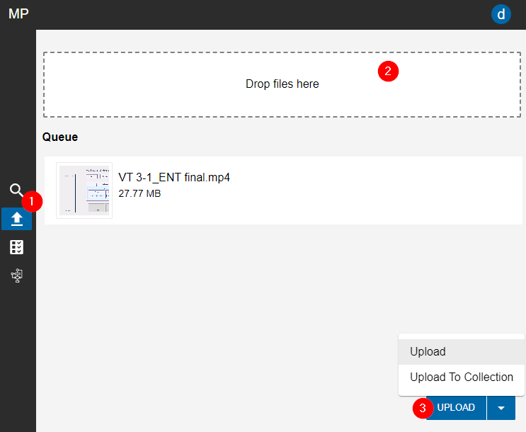 As shown in the mage below, any already added files will be visible in the queue. This ensures that the user has an overview of the material they are adding. Additionally users get to choose whether to simply upload their files into the system or specify a particular collection as the destination (3).
