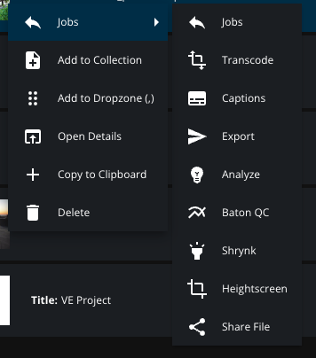 A range of VidiCore jobs can be triggerd on items. It displays an overview of the generally existing processes. Hence not all of them might be available in a specific VidiCore instance. Following options require additional services or configuration (The dialog will indicate missing elements when selected):