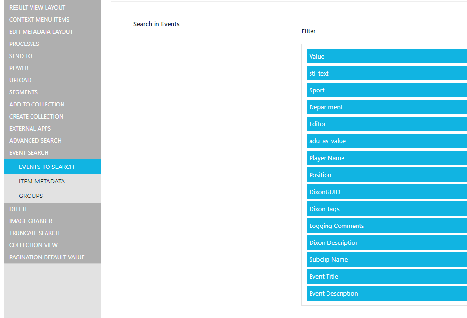 In this area, the administrator configures the fields the event search is performed on. This can be timed and non-timed metadata. Select the metadata values from the ones which have been already configured ConfigPortal.
