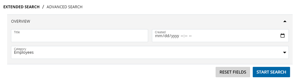 By entering or selecting values for dedicated fields, users can achieve a more relevant search results that meet all input criteria. Administrators can define which metadata fields are expressed here and how these are arranged. Different metadata fields operate with different controls: insert simple text, choose from a dropdown or select a matching date/time (range):