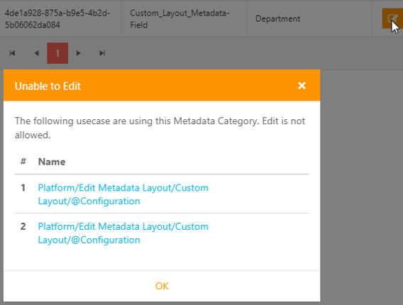 If the field is already used as a criterion for one of the layouts, those layouts must first be deleted before another field can be chosen. Should this be the case, the user will get a message when attempting to edit the Custom Layout Metadata field.