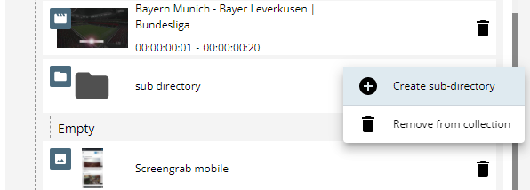 Collections can be accessed directly within the search results. Selecting a collection will show which items or sub collections are inside, allowing for a more refined search. The same principle applies to editing projects, such as from Premiere or VidiEditor.