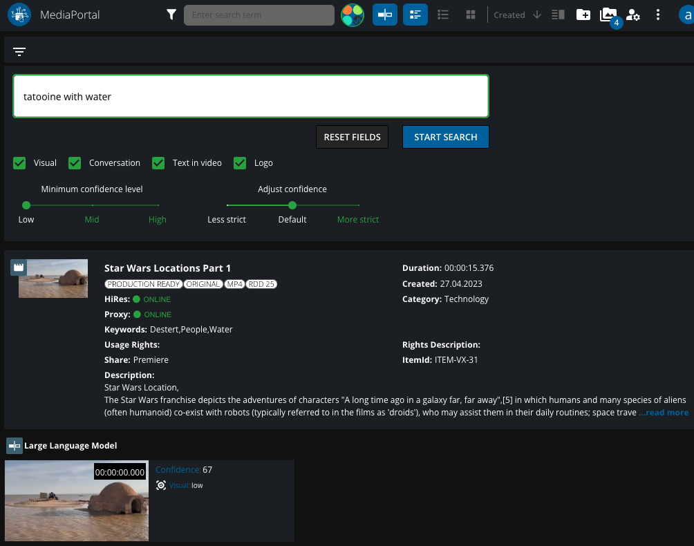 Enable natural language search through integration with a third-party service, Twelve Labs. This functionality facilitates synchronized searching with Twelve Labs, enabling users to formulate queries using natural language on a multi-modal search engine. Results can then be combined with other available metadata in VidiCore.