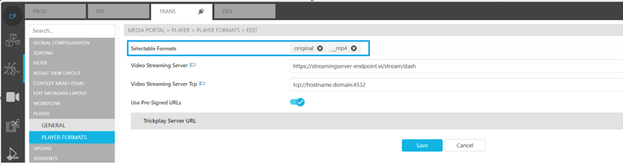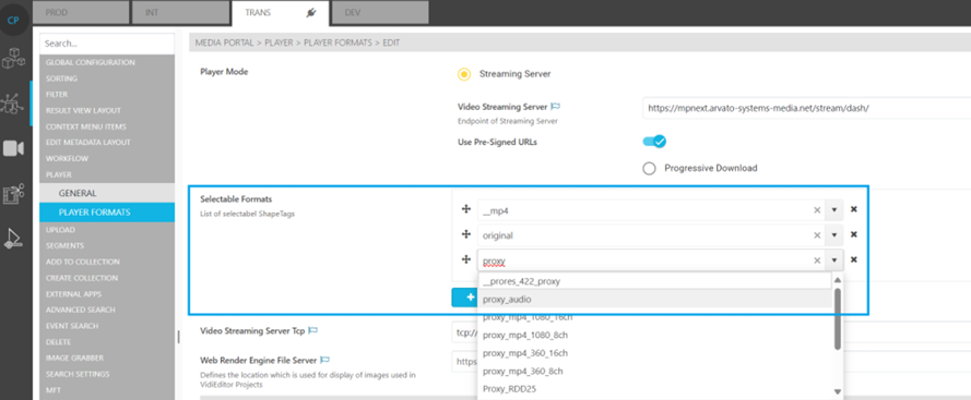 Step 1: Open the ConfigPortal to review the current configuration settings related to 'Selectable Formats.' By default, the available formats are set to 'original' and '__mp4' to accommodate the player's default preferences. If these values correspond to your requirements, there is no action required after deploying to a version later than 23.4. If the values differ, follow the steps below.
