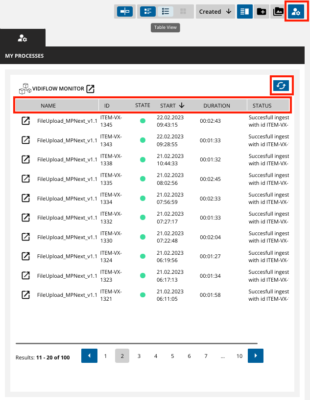 Under My Processes, there is a function which is located on the top right to get an overview of the last VidiFlow workflows a user triggered. It will request the last 100 workflows a particular user performed. The feature provides an overview of the Wf-Name, Item/Collection-ID, Status light, Start Time, Duration and Status Message from a Workflow. A manual refresh can be triggered.