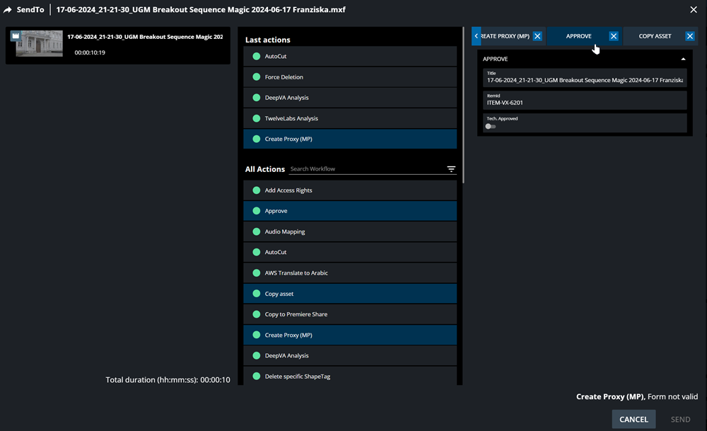 Values can be set to mandatory, which is indicated with an *, or filled with a pre-configured values. The SEND button stays inactive unless all necessary fields are filled. You can switch between the tabs for different workflows or deselect a workflow by clicking on X. The displayed metadata can be organized in different regions, similar to metadata editing dialog. Changing metadata here will provide this as input to the workflow, but not persist it on the selected content, unless the workflow is configured for it.