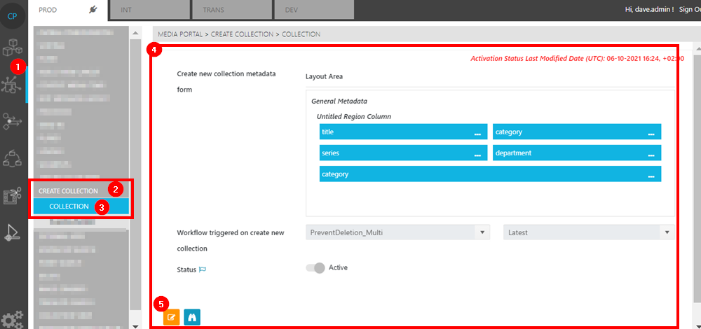 Once you have entered the MediaPortal configuration module (1) in ConfigPortal, and selected the Create Collection functional use case category, users have the option to further select to pages.