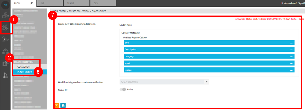 Selecting the Collection page from the navigation menu, users will be offered a view of the current configuration choices (4) for collections when these are created. As can be seen in the image below, the layout area provides the selection of metadata fields and their arrangement.