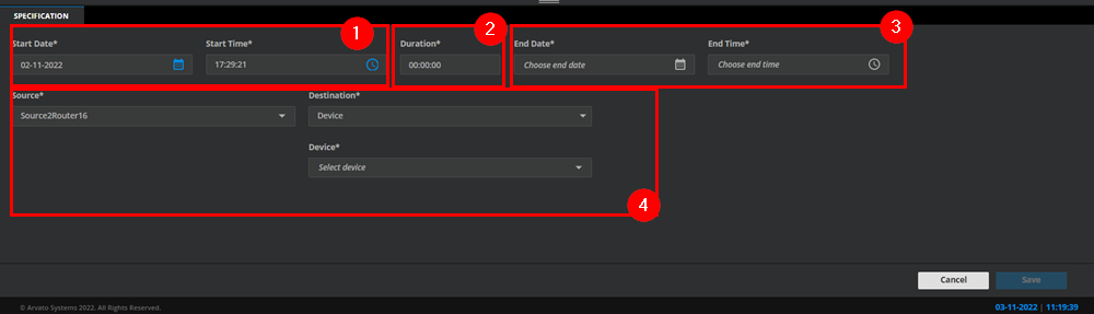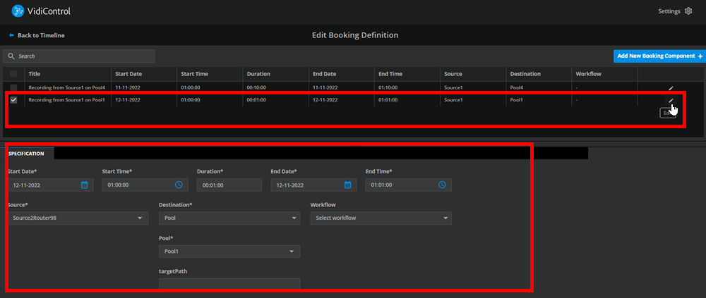 Source and Destination (4): This specifies the ingest source for the booking component and the intended recording. The destination parameter specifies the devices or allocation of devices (port) in the form of a pool used for the recording.
