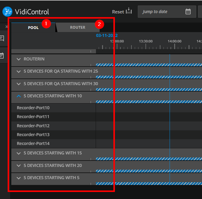 The Sources section on the timeline specifies whether the lanes are broken down as individual devices (2) or device pools (1).