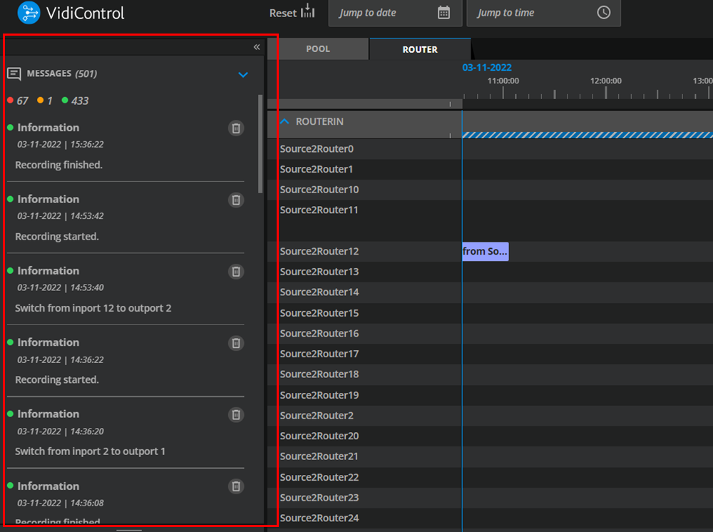 Once one has opened the notification area, users are able to see individual messages provided by VidiControl. These indicate if a recording was: