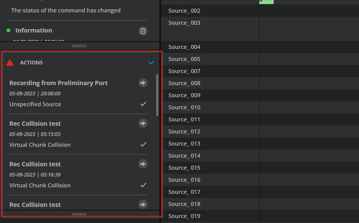 The Actions overview visualizes manual actions that the user must perform to correctly execute a scheduled recording. All actions are displayed to the user 48 hours before the occurrence of the event on the relevant recording happens. The parameter can be configured for all individuall actions.