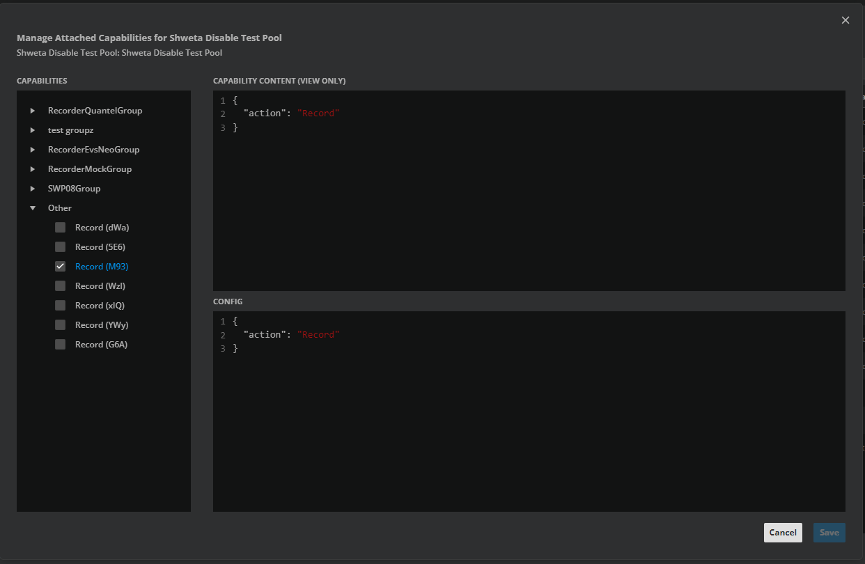 A modal dialogue opens to manage the Capabilities that are attached to a pool:
