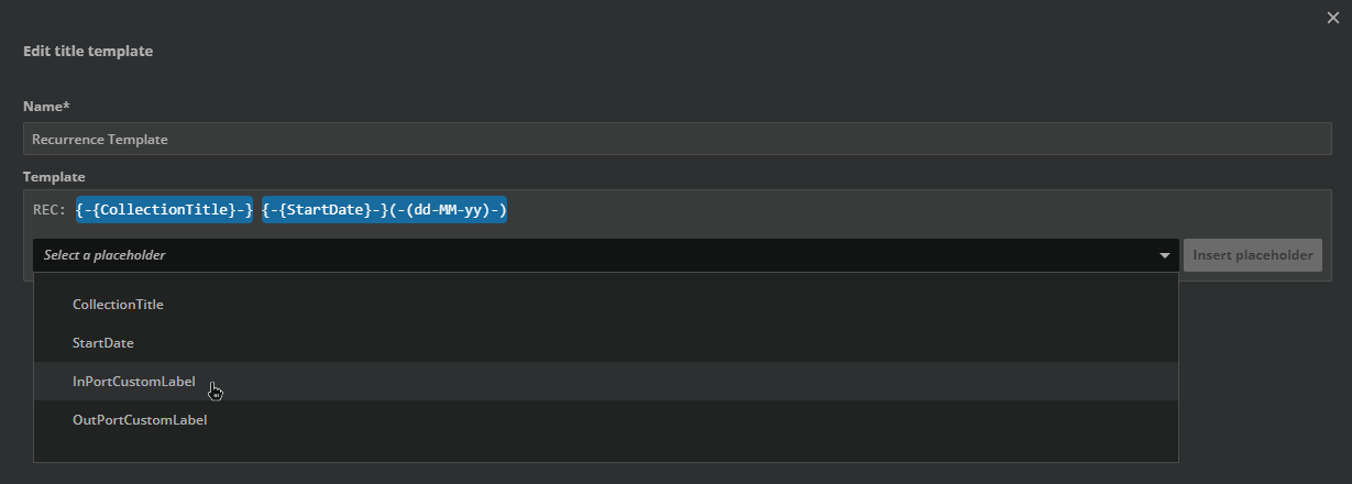 Use the Placeholder dropdown menu to select a placeholder to be inserted and press the “Insert Placeholder” button to insert the placeholder at the current cursor position.