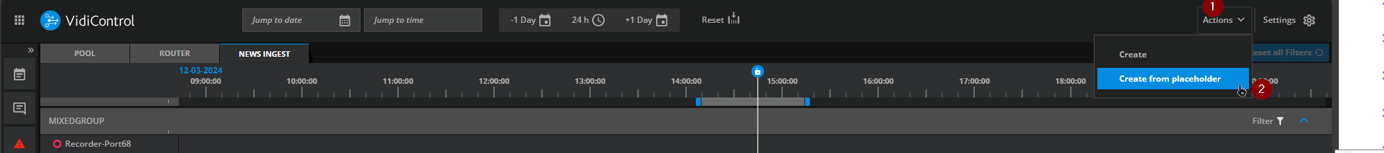 The Create a Booking area can be reached from the main UI by selecting the “Create” or “Create from placeholder” option (2) from the “Actions” dropdown (1).