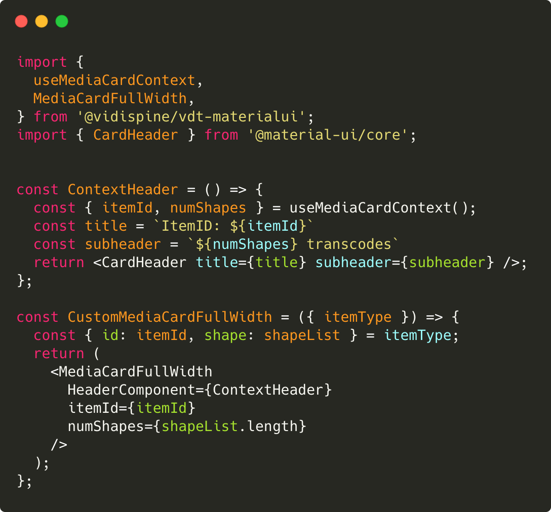 We have also wrapped the MediaCardFullWidth in a context which makes it easier for your custom child components to access props set on the parent.