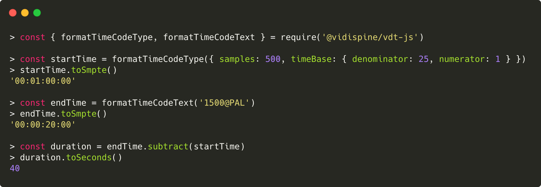 The TimeCode object has methods to add or subtract other timecodes which makes it simple to return the duration between a start and end.