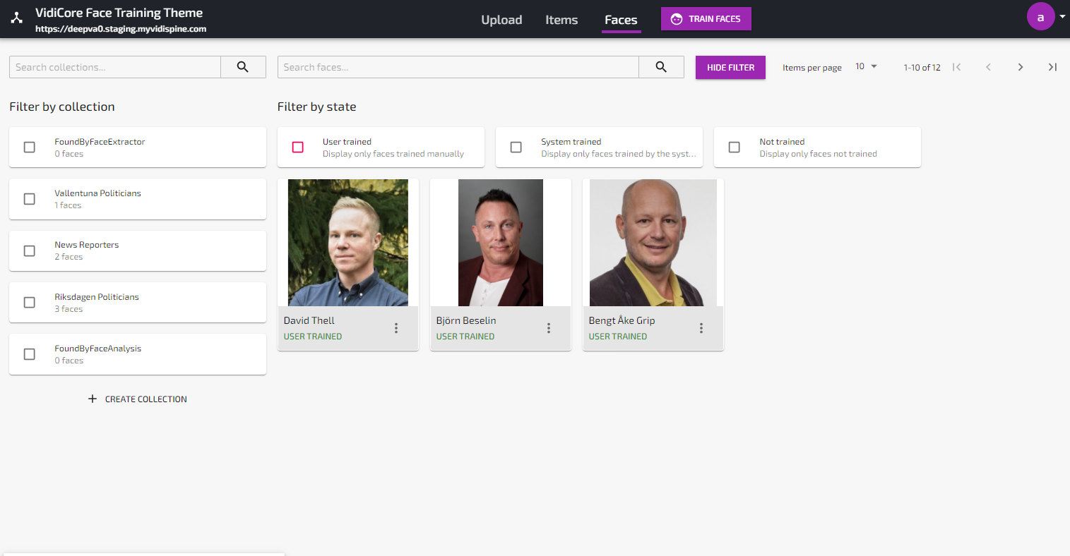 The Face Training Theme for VidiCore runs as a serverless one-page application. The latest compiled version can be found here: https://vidispine.github.io/face-training-theme/. This version can be run towards any VidiCore system which has been properly configured for use with DeepVA services. See instructions above.
