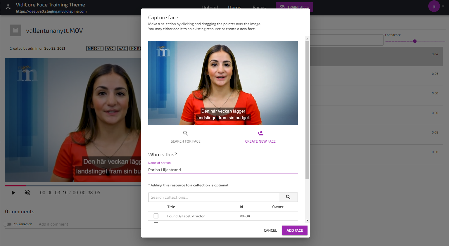 As an alternative to manually uploading image files or using the Face Extractor service, faces can be manually captured from any video in the system. This function will create a new face which must be manually trained in order to be used for subsequent face analysis jobs.