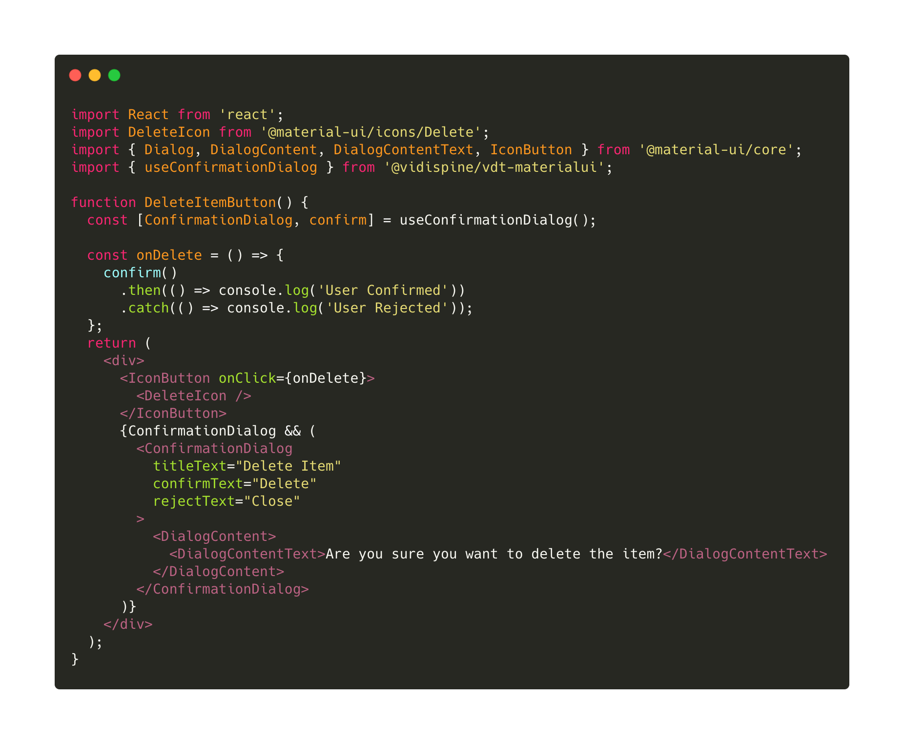 This react hook will display a dialog and return a promise which you can use to determine whether the user confirmed the action. You can specify options to use your own component or whether to return a boolean instead of rejecting the promise.