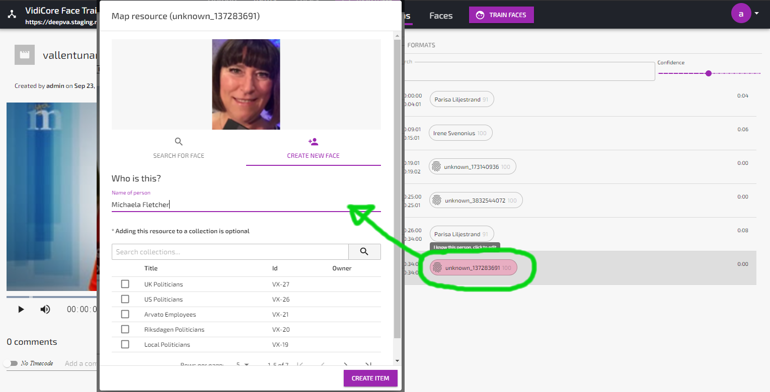 All faces found by the Face Training and Analysis Powered by DeepVA are automatically fingerprinted and stored in the DeepVA data model, and will be used on all subsequent analyzes of any video content, along with all manually uploaded/trained faces. Unknown faces will be labeled “unknown_xxx” until given a name. When given a name, this name will automatically be indexed and can be used in the search function. Clicking a search hit will open the video asset and position the playhead to its first appearance of the face in the video.