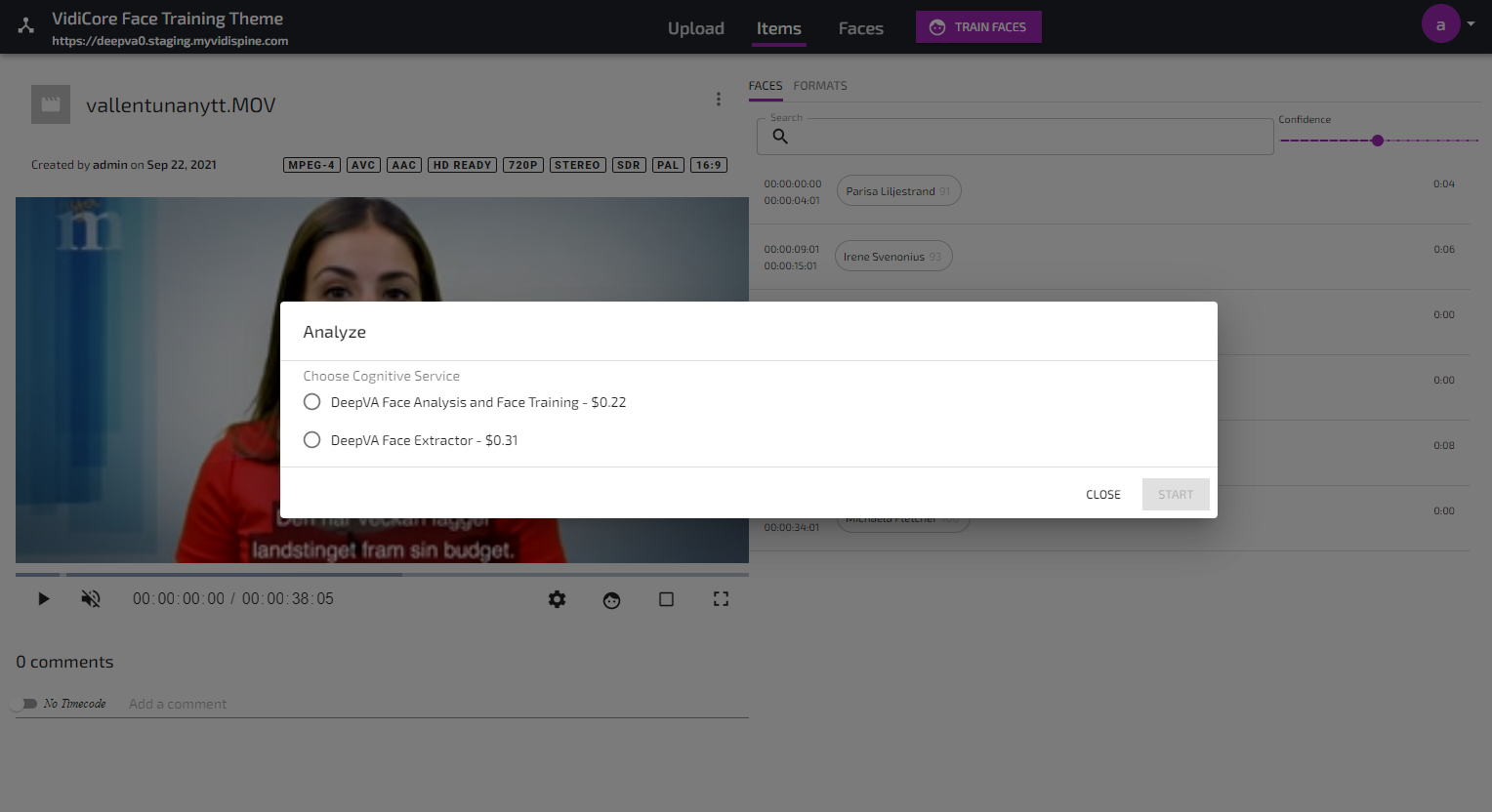 The DeepVA Face Training Theme for VidiCore is an application designed to visualize the capabilities of the DeepVA Face Recognition & Analysis services in VidiNet. The application contains functions for analyzing video content with DeepVA AI services in VidiNet, managing and organizing the face datamodel/database with VidiCore, train the data model with known faces prior to analysis of content, grab faces in videos manually, and much more. The powerful indexing services in VidiCore makes it easy to find and display persons and faces using timecoded metadata in combination with AI.