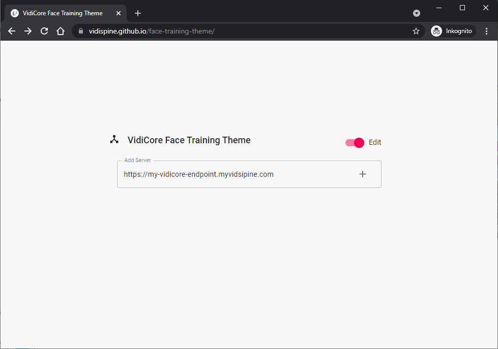 The Face Training Theme for VidiCore runs as a serverless one-page application. The latest compiled version can be found here: https://vidispine.github.io/face-training-theme/. This version can be run towards any VidiCore system which has been properly configured for use with DeepVA services. See instructions above.