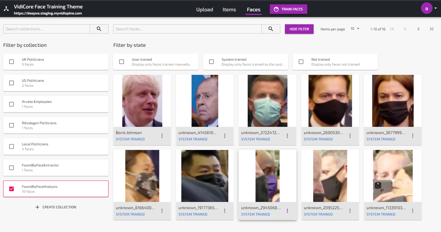 The Face Training Theme for VidiCore runs as a serverless one-page application. The latest compiled version can be found here: https://vidispine.github.io/face-training-theme/. This version can be run towards any VidiCore system which has been properly configured for use with DeepVA services. See instructions above.