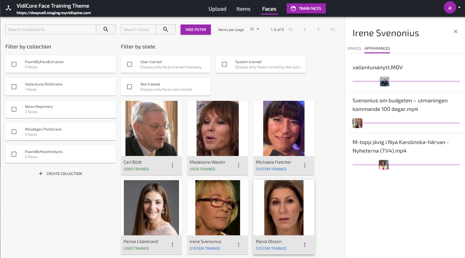 The DeepVA Face Training Theme for VidiCore is an application designed to visualize the capabilities of the DeepVA Face Recognition & Analysis services in VidiNet. The application contains functions for analyzing video content with DeepVA AI services in VidiNet, managing and organizing the face datamodel/database with VidiCore, train the data model with known faces prior to analysis of content, grab faces in videos manually, and much more. The powerful indexing services in VidiCore makes it easy to find and display persons and faces using timecoded metadata in combination with AI.