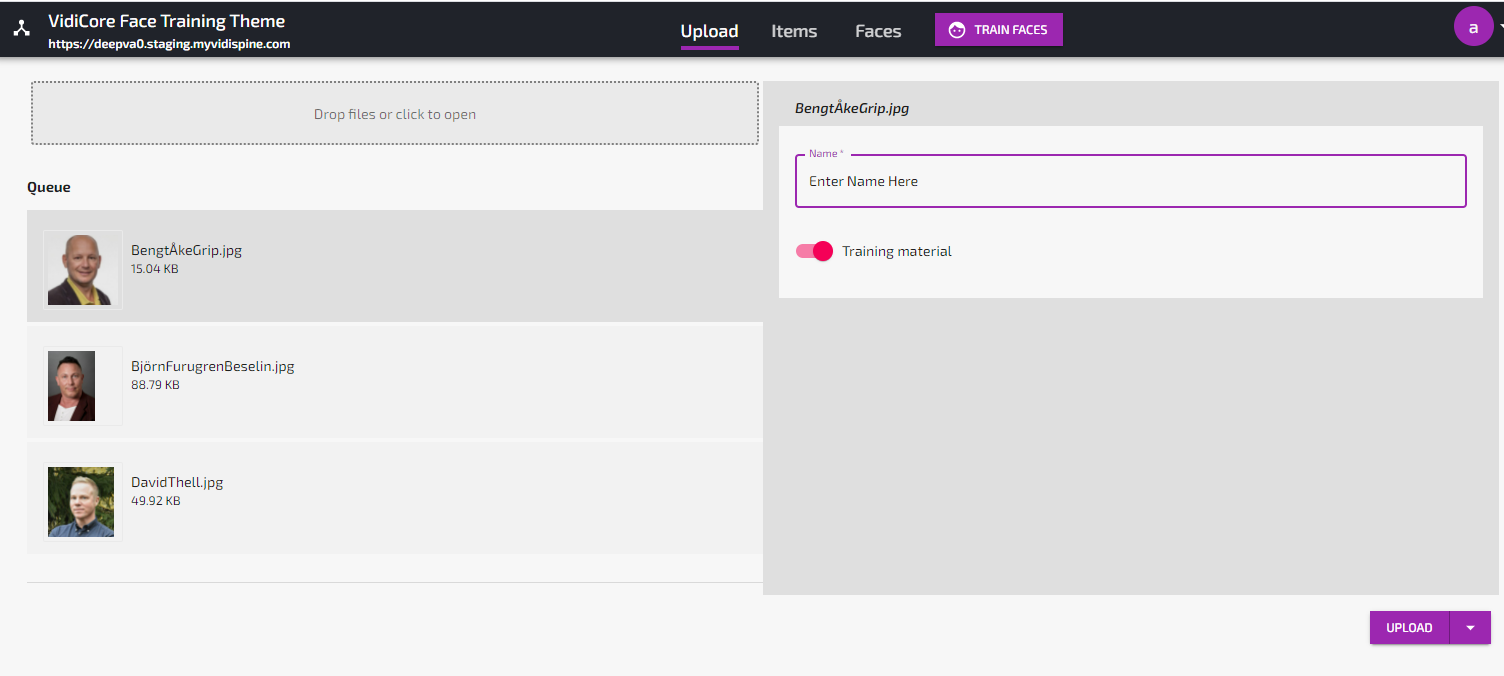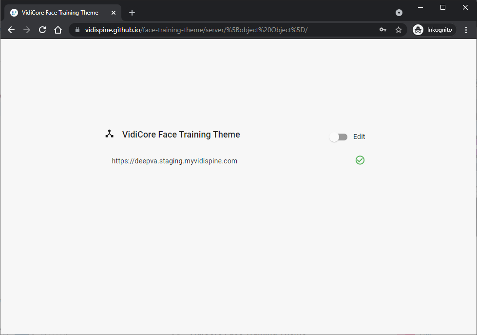 The Face Training Theme for VidiCore runs as a serverless one-page application. The latest compiled version can be found here: https://vidispine.github.io/face-training-theme/. This version can be run towards any VidiCore system which has been properly configured for use with DeepVA services. See instructions above.