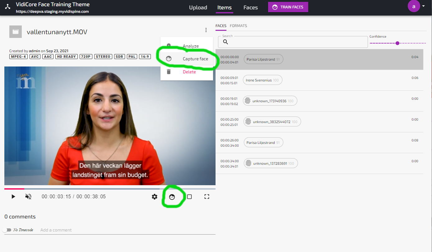 The DeepVA Face Training Theme for VidiCore is an application designed to visualize the capabilities of the DeepVA Face Recognition & Analysis services in VidiNet. The application contains functions for analyzing video content with DeepVA AI services in VidiNet, managing and organizing the face datamodel/database with VidiCore, train the data model with known faces prior to analysis of content, grab faces in videos manually, and much more. The powerful indexing services in VidiCore makes it easy to find and display persons and faces using timecoded metadata in combination with AI.