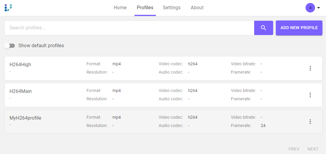 Default VidiCore transcoding profiles can be displayed by clicking on “Show default profiles”