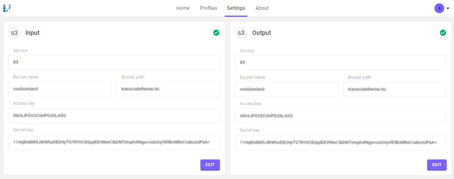 Your VidiCore system will also need to be configured with one input storage and one output storage on AWS S3. This is done from within the Transcode Theme application itself. You will be needing your S3 access key, S3 secret key, at least one S3 bucket in the same AWS region as your VidiCore system (preferably), or geographically as close to your VidiCore system as possible if you are running a local system. For the input and output storage configuration, you can either use two different folders within the same S3 bucket, or two different S3 buckets.
