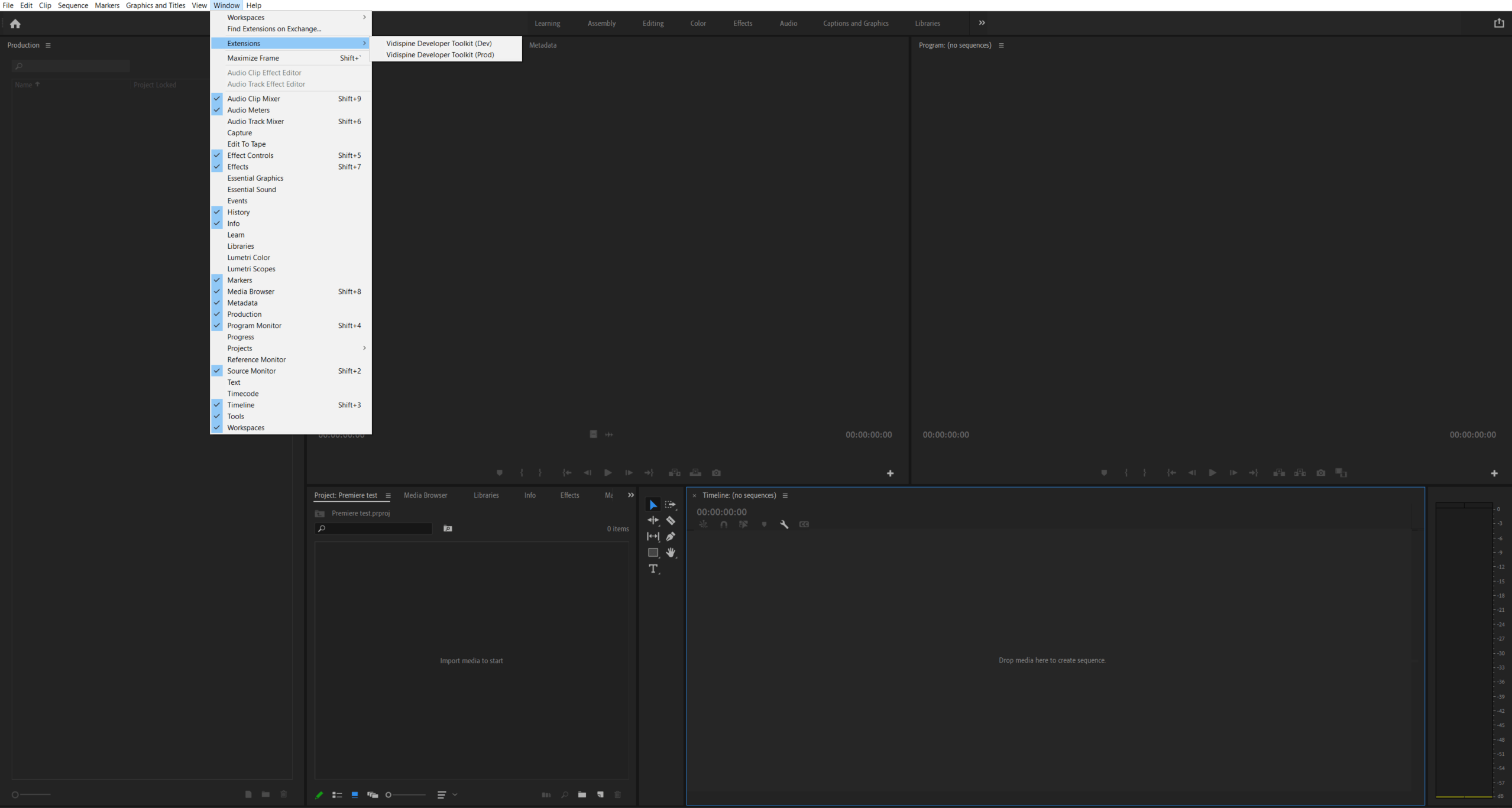 After installing the extension, restart the Adobe Premier Pro application and under Window -> Extensions will be available 2 versions - Production and Development versions.