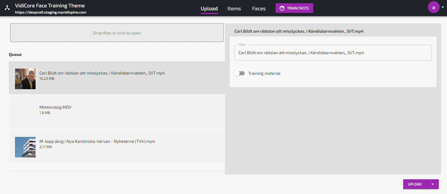 Once you have logged in, you need to populate the system with some video content - preferably content containing people and faces. For this, you can use the Upload function. The upload will create one VidiCore item for each video, with two VidiCore shapes per Item - one shape for the original file and one shape in mp4 lowres format used for playback in the browser. (If you are unfamiliar with the concept of items and shapes it is explained here: Entities in Vidispine)