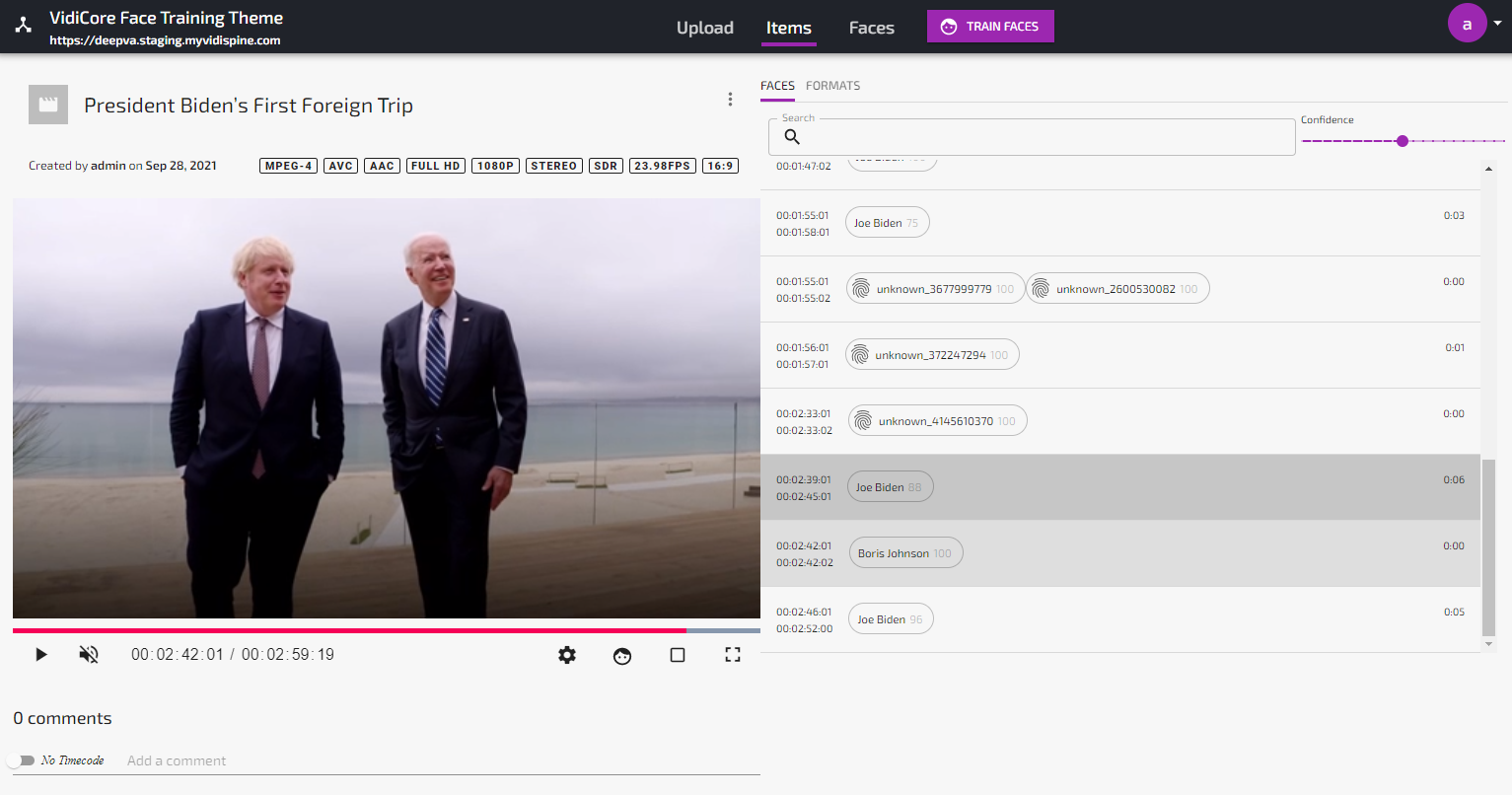 The Face Training Theme for VidiCore runs as a serverless one-page application. The latest compiled version can be found here: https://vidispine.github.io/face-training-theme/. This version can be run towards any VidiCore system which has been properly configured for use with DeepVA services. See instructions above.