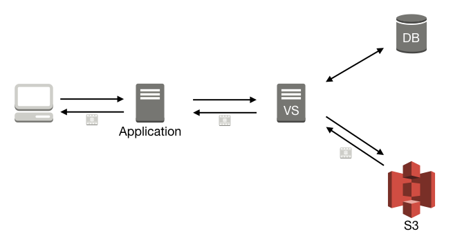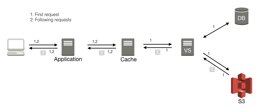 So, say that you have requested your list of thumbnails using /API/item/VX-255?content=thumbnail&noauth-url=true, and got your list of URIs where you can fetch your thumbnails, e.g., http://vs.example.com:8080/APInoauth/thumbnail/VX-6/VX-255;version=0/2250@PAL?hash=6cd7a9eaa84c31dc4b42917b5771a9ae. This URI will never change for thumbnails and posters, and you can easily set up a reverse proxy, e.g., nginx or Varnish to cache those, and avoid the roundtrip into Vidispine (see figure 2). In this case you will cache everything under /APInoauth/thumbnail/. You can cache posters in a similar way. The example would of course work for files on any storage, it doesn't have to be Amazon S3.